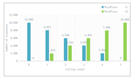 The experiment considers upgrading the WordPress application from version v1 to version v2. For the sake of observation, we developed a service endpoint for WordPress server, observe/rollout/version, which returns the version name of the component. The progress of rolling update can be estimated by looking at accumulated response time from each version. Since incoming requests are evenly distributed across the replica set, elapsed times of each version would represent its share of the total processing capacity. Figure 12 illustrates the progress of the rolling update in terms of the response time, as its update round performs repeatedly. In addition, 10,000 requests are generated by using Apache server benchmarking tool (ab -n 10,000 -c 1 <service-host/observe/rollout/version>). As shown in the graph, all traffic is initially handled by v1 replicas. According to the rollout strategy batch: 20% that we use, every round, one fifth of the replicas are being replaced with a new version, which can be observed from the correspondingly increasing response time of the new replicas.
