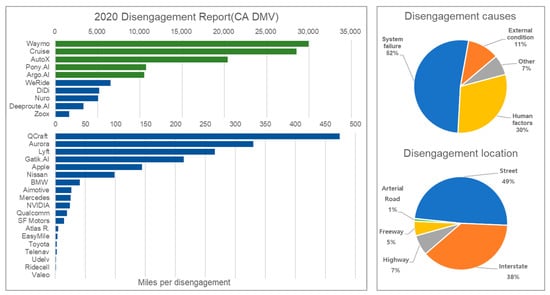 California, U.S.A., is one region where research on autonomous driving is actively conducted. There have been licensed autonomous driving tester programs on public roads since 2014, and an unmanned autonomous driving test program has been operated since 2018 [6]. As of 25 February 2021, there were a total of 56 autonomous-vehicle testing permit holders and seven autonomous-vehicle driverless testing permit holders registered with the California Department of Motor Vehicles (DMV). Every year, both types of permit holders must track and report the number of times their vehicles needed to disengage from the autonomous mode during the tests. The top-level group drove about 1200 miles per disengagement in 2015 [7]; in 2020, they drove more than 23,000 miles per disengagement on average [8]. However, even in 2020, the autonomous driving system still frequently failed to respond except for the top group (on average, they drove 80 miles per disengagement) (Figure 1). The top causes for this were system failure (52%), driver factors (30%), and external environmental factors (11%) [9].