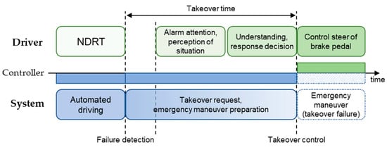 Next, based on statistical data, the disengagement scenarios are implemented under a sensor or system failure scenario or in other predefined scenarios [20,21]. Finally, the optic, acoustic, and haptic HMI are configured to warn the driver to return to driving, and the effectiveness of each notification method is analyzed [22,23,24]. The effect of the complexity of surrounding traffic vehicles or the type of NDRT on the takeover quality has been analyzed. The probability of collision and the tendency to avoid accidents through steering was significantly increased under high-density traffic conditions [25,26]. The type of NDRT did not significantly affect the time required for the takeover, but it affected the takeover quality [27]. In autonomous driving mode, the driver’s gaze behavior reflected the level of distractedness, and specific gaze parameters were suitable to assess the adequacy of the driver’s monitoring strategy [28]. Since studies on HMI configuration and driver response focus on average or median values or only on extremely urgent scenarios, differences among individuals must be considered [29].