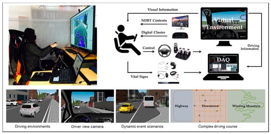Figure 3 indicates the HITL simulator used in this study and depicts of the parts interacting with the driver and the actual hardware. The driver’s steering, gear, and pedal inputs were collected from a laptop and real-time processor and were transmitted to the main PC where the simulator was driven. The virtual driving environment was presented to the driver, visually very similar to what is seen from the driver’s seat of an actual vehicle, through a large-screen (55 inches) 4 K resolution TV. A touch monitor for NDRT was placed between the driver and the TV. Static environments such as roads, traffic lights, and buildings, as well as dynamic obstacles such as vehicles, pedestrians, and bicycle occupants, were implemented using IPG CarMaker. This software provides solutions for virtual test driving, including basic vehicle systems such as dynamics and powertrain, driving scenario generators, autonomous driving sensor models, and realistic visual graphics.