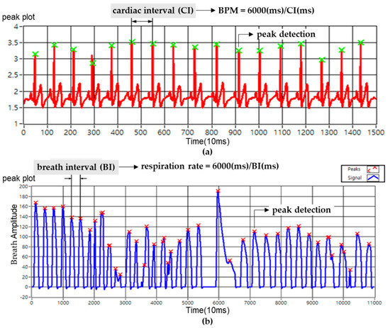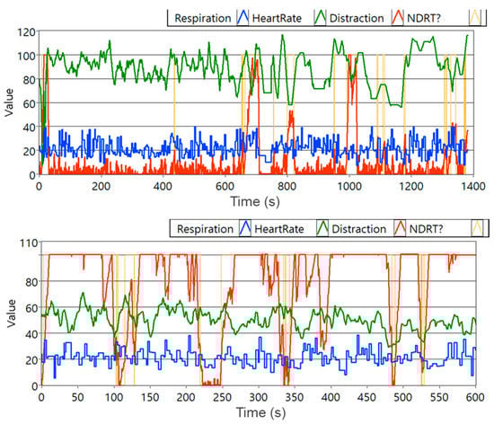 In this study, a respiration and ECG sensor was attached to the driver to analyze data patterns in the manual driving, autonomous driving, and takeover scenarios. As shown in Figure 5, biosignal data were acquired while driving, and peaks were detected in real-time to calculate heart rate and respiration rate. According to the UNECE ALKS regulation [5], four conditions (driver control input, eye blinking, eye closing, and conscious head or body movement) have been cited as examples for determining driver availability. Furthermore, it has been suggested that gaze direction toward the front road or rear-view mirror or head movement toward the driving task could be considered as a criterion for determining the driver’s attentiveness. Studies predicting driving behavior from gaze patterns [56] or measuring cognitive workload during driving [57,58,59] have been conducted.