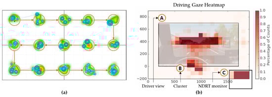 In this study, the driver’s gaze data were acquired using a Tobii eye tracker having an accuracy of less than 0.1° and a sampling rate of 90 Hz. Thus, the location information that the driver is watching on the simulation screen at a level could be used for research using this device via calibration as in Figure 6a [60]. The eye-tracking system was developed by referring to the hardware mounting condition and calibration method proposed in Gibaldi’s study [41]. Figure 6b shows the results of eye tracking when manually driving the experimental course using the MATLAB heatmap function. In this figure, area A represents the simulator screen displayed as the front screen, area B is the cluster monitor between the steering and screen, and area C is the location of the touch display used for NDRT work.