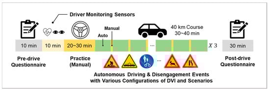 The takeover process proceeds with non-driving-related tasks (NDRTs), a disengagement scenario, and warnings raised through HMI as shown in Figure 2 [17,18]. Quantitatively evaluating the situation wherein the driver concentrates on other tasks in the autonomous driving mode is essential. Tasks such as phone calls, radio listening, video viewing, text entry, N-back tasks, and surrogate reference tasks (SuRTs) are then assigned to drivers, and metrics such as the NASA task load index (NASA-TLX) are used to evaluate the workload [19].
