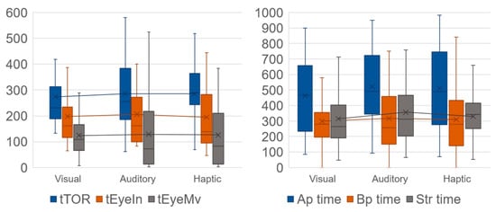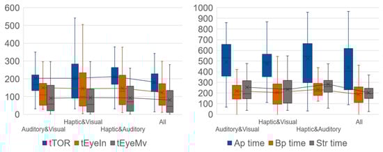 As shown in Figure 8, the multimodality takeover experiments were conducted in the same course as the single modality experiment. One of the complex notification methods was provided while driving the course twice. When a complex notification including visual, auditory, and haptic features was provided, the driver reaction to the takeover scenario was observed 377 times, and the results are shown in Figure 13. In the case of a complex modality composed of two notifications, no significant difference in any of the dependent variables with one-way ANOVA (tTOR, p = 0.065; tEyeIn, p = 0.22; tEyeMv, p = 0.98; Ap, p = 0.65; Bp, p = 0.10; Steer, p = 0.29) was observed, as with the single-modality result. However, a difference in terms of the increase in the switching time, brake, and steering operation timing was observed, which are important variables in the takeover response. If all three notifications were included in the multimodal notification, the brake timing (p = 0.034) and steering timing (p = 0.006) were distinct, while the takeover time (p = 0.058) was slightly different.