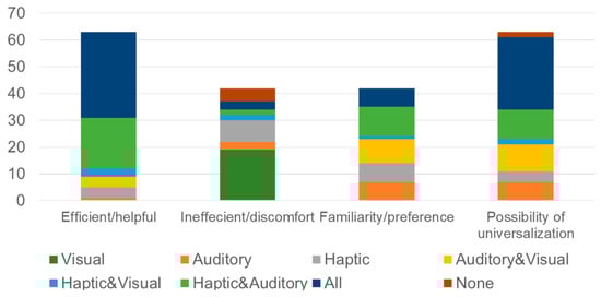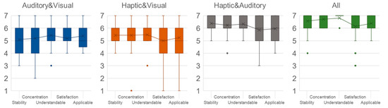 As with the results of the single modality, the experimental results were good when a visual notification was included. However, there were many negative responses in the questionnaire, and the score was relatively low (Figure 14, average scores are 5.26, 5.31, 6.15, 6.52). In the case of auditory and haptic notifications, the overall score was similar to that when all notifications were provided, and the short-answer question about the effectiveness of the notification method in Figure 12 ranked second.