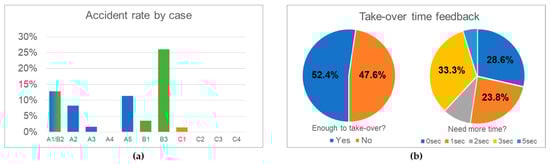 Among the 641 takeover cases, 37 (5.8%) accidents occurred, and in the case of multimodality notification, it took approximately 2 s to takeover. Therefore, there was some margin compared to the time the notification was provided (TTD < 5 s). Nevertheless, about 47.6% of drivers assessed that the notification time was insufficient, and they requested an additional time of about 1.67 s on average (Figure 15b).