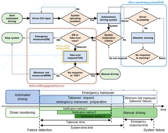 A flow chart of the takeover process of a highly automated vehicle is provided in Figure 19 based on the results of all the experiments. At the beginning of the procedure, the system, which receives the driver’s willingness to use through DVI, determines whether to wear a seat belt, and satisfies the system operational design domain (ODD). Then, it decides to switch to the autonomous driving mode. While the autonomous mode is active, the system continuously checks the driver availability with gaze and head orientation information and system operating conditions. The system periodically makes the driver aware of the driving environment to improve the reaction speed and success rate in takeover scenarios.