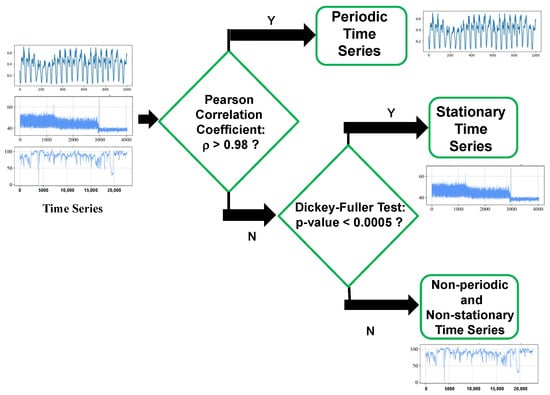 The proposed anomaly detection framework, Tri-CAD, for univariate time series is introduced in this section. As shown in Figure 3, Tri-CAD first classifies time series into three classes: (Class 1) periodic, (Class 2) stationary, and (Class 3) non-periodic and non-stationary time series. The classification is based on the Pearson product-moment correlation coefficient [] and Dickey–Fuller test []. The threshold settings in Figure 3 for the Pearson product-moment correlation coefficient ρ and the Dickey–Fuller test p-value will be described later. The first D (say, D = 1000) data are assumed to be normal and are used for the classification. Below, in this paper, the set of the first D data is called the normal dataset or the training dataset, whereas the set of the rest of the data is called the test dataset.