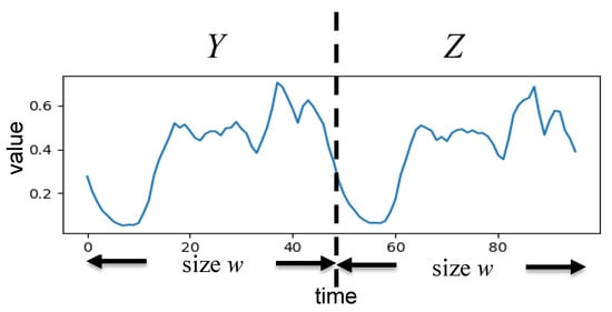 A time series X = (x1, x2, …) is a sequence of observations (or data) ordered chronologically, where xt is recorded at a specific time point t, where t is a positive integer []. It is usually assumed that time points are equally separated. Based on the properties of observations, we have two types of time series. On the one hand, if observations of a time series are scalar values, then the time series is a univariate time series. On the other hand, if observations are multi-dimensional vectors, then the time series is a multivariate time series. This paper focuses on univariate time series; therefore, we use “time series” to stand for “univariate time series” in the following context.