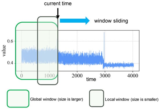 When the time series is determined to be stationary, Tri-CAD calculates the means of the data within a large global sliding time window and a small local sliding time window, as shown in Figure 5. The global window and the local window have the same ending time point. Furthermore, the size (say, 100) of the global window is much larger than the size (say, 5) of the local window. For a data point x, the means of its global window and local window are first calculated, which are denoted as Gmeanx and Lmeanx, respectively. Then, x’s anomaly score sx is calculated according to (10).