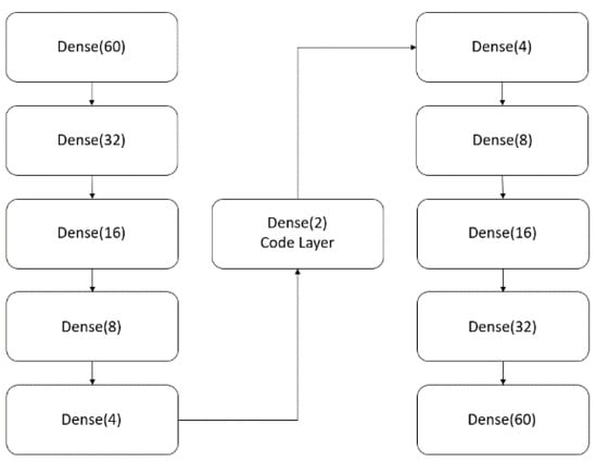 The AE neural network structure is shown in Figure 6. The sizes of the input layer and the output layer are both ws (say, 60). The numbers of neurons in the hidden layers are 32, 16, 8, 4, 2, 4, 8, 16, and 32, respectively. The code has the dimension of 2, as the number of neurons in the middle layer is 2. The encoder takes the scaled exponential linear unit (SELU) function as the activation function, whereas the decoder takes the hyperbolic tangent (Tanh) function as the activation function. The error function (or loss function) is the mean square error (MSE), and the optimizer is the adaptive moment estimation (Adam). To avoid overfitting, the early stop mechanism is used. Specifically, a part of the training dataset is split out to be the validation data set. The training process of the AE model proceeds epoch by epoch. Once the MSE value of the validation data starts to rise, the training stops, so that the AE model does not fit the training data too closely to avoid the overfitting problem.