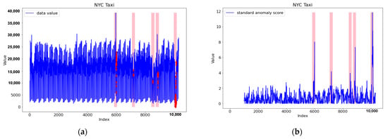 Figure 7, Figure 8, Figure 9, Figure 10, Figure 11, Figure 12, Figure 13 and Figure 14 show the performance evaluation results of Tri-CAD using the three NAB datasets with the deviation threshold set as 3.89, 8, and 8.35, respectively. The performance evaluation is also conducted for different training dataset sizes and different WT sliding time window sizes. Specifically, the NYC taxi dataset and the CPU utilization dataset are assumed to have training datasets with a small size of 500 or a large size of 1000 (i.e., D = 500 or 1000). The machine temperature dataset is assumed to have training datasets with a small size of 1000 or a large size of 2000 (i.e., D = 1000 or 2000). Moreover, the machine temperature dataset is also assumed to have WT sliding window sizes of a small size of 30 or a large size of 60 (i.e., ws = 30 or 60). In Figure 7, Figure 8, Figure 9, Figure 10, Figure 11, Figure 12, Figure 13 and Figure 14, the anomaly windows are marked with pink strips, whereas detected anomalies are marked with red dots. If anomalies are claimed to be detected in an anomaly window by the proposed framework, then TP is increased by one. On the contrary, if anomalies are claimed to be detected in a normal window, then FP is increased by one. Note that all anomalies in a time window altogether increase a count by one. Similarly, if no anomaly is claimed to be detected in an anomaly window, then FN is increased by one. After TP, FP, and FN are derived, the precision, recall, and F1-score can be evaluated accordingly.