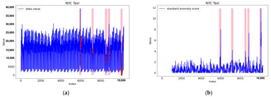 Tri-CAD performance evaluation using NAB NCY Taxi dataset with training dataset size D = 500: (a) the time series and anomaly points and (b) standard anomaly scores and anomaly windows.