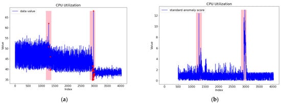 Tri-CAD performance evaluation using NAB AWS CPU Utilization dataset with training dataset size D = 500: (a) the time series and anomaly points and (b) standard anomaly scores and anomaly windows.