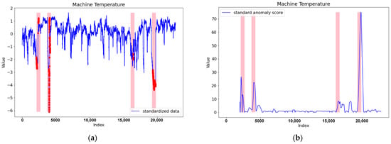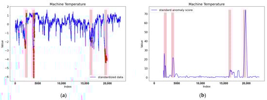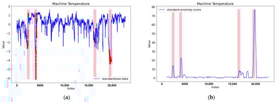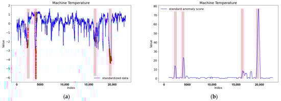 Tri-CAD performance evaluation using NAB Machine Temperature dataset with training dataset size D = 1000 and WT window size ws = 30: (a) the standardized time series and anomaly points and (b) standard anomaly scores and anomaly windows.