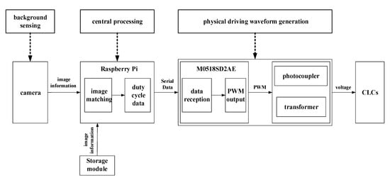 Figure 1 shows the block diagram of the proposed camouflage control system, which consists of the background sensing part, the central processing part, and the physical driving waveform generation part. In the background sensing unit, the camera (PI NOIR CAMERA V2) samples images of the environment. The central processing unit is based on a Raspberry Pi embedded board, used to conduct the dominant color feature matching algorithm, as well as to output the encoded signal to M0518SD2AE MCU through USB-TTL chip (CH341T). The physical driving waveform generation outputs adjustable AC voltage with an amplitude of 0–250 V (RMS value), which tunes the photoelectric characteristics of the CLCs devices.