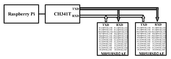 In this study, the host Raspberry Pi was connected with two M0518SD2AE MCUs, as shown in Figure 8. The first slave M0518SD2AE MCU outputted the PWM signals with duty ratios of 10%, 20%, 30%, and 40%, as shown in D0, D2, D4, and D6, respectively, and the second slave M0518SD2AE MCU outputted the signals of D1, D3, D5, and D7, respectively. Each M0518SD2AE MCU can only output 24 PWM channels, and therefore multiple slaves are required to work together when displaying a complete camouflage image.