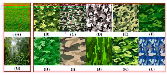 The environment and camouflage images. (A) Environmental of grassland image; (G) environmental of jungle image; (B–F,H–L) camouflage images used in the experiment.