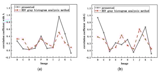 Comparison of matching results between the method we proposed and the HSV gray histogram analysis method. (a) The correlation coefficient with A; (b) the correlation coefficient with G.