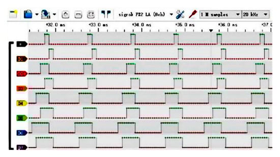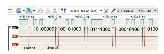 After the serial port configuration, the Raspberry Pi sends data, and the pulseview tool is used to connect the TXD pin of CH341T to capture data sent by the Raspberry Pi. Figure 7 shows that the captured data sent by the Raspberry Pi contained one start bit, eight data bits, and one stop bit.