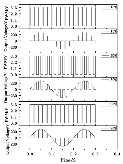Figure 10 shows the relationship between the duty cycle and RMS value of output voltage. After curve fitting, the relationship between output voltage and PWM duty cycle is expressed as