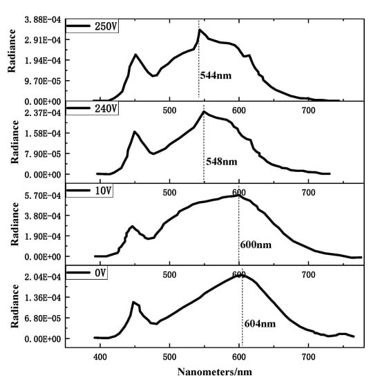 Figure 11 shows the movement of the reflection band of the CLCs under different voltages. The peak wavelength of the reflective band of CLCs was shifted from 604 to 544 nm with the voltage tuned from 0 to 250 V. After taking the environment image, the physical driving waveform generation part outputs the corresponding voltage signal to make the CLC device display the similar color with the environment for the purpose of camouflage.