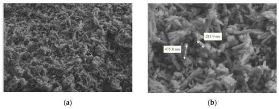 The nano-clay was supplied by the same company. Known as Halloysite nanotubes, it is a type of alumino-silicate clay (Al2Si2O5 (OH)4.2 H2O with 1:1 layer) with a cylindrical shape. The cylindrical particles have an outer diameter of 30 to 70 nm and a length of 200 to 650 nm. Its surface area is approximately 57 m2/g, and its color is white to tan, as reported by the supplier. It is composed of double layers of alumina, silicon, oxygen and hydrogen. Silica, with a negative charge, is located mainly on the outer surface of the nano-tube, and alumina, with a positive charge, is located on the inner surface and on the edges of the nano-tube [25]. Figure 1 shows an image of the nano-clay obtained using field emission scanning electron microscopy (FESEM). Images were captured to show the particles at 30.00 and 10.00 magnifications. The images show that the particles of halloysite nanotubes are tubular and their length ranges from 600 to 250 nm, which is the same as reported by the supplier.