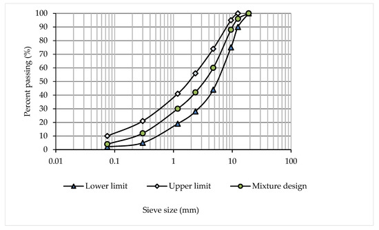 The aggregate used in this research was granite with a maximum particle size of 19.0 mm. The aggregate gradation is illustrated in Figure 2. Air voidage of 4% was selected for all mixtures of the OBC. Mixing and compaction temperatures were determined based on the results of rotational viscosity. The mixing temperature was chosen as the range corresponding to 0.17 ± 0.02 Pa.s, while the compaction temperature was chosen as the range corresponding to 0.28 ± 0.03 Pa.s. The selected mixing temperatures were 155 °C, 160 °C and 163 °C for 0 NCMB, 2 NCMB and 4 NCMB, respectively, while the selected compaction temperatures were 146 °C, 150 °C and 152 °C for 0 NCMB, 2 NCMB and 4 NCMB, respectively. The OBC for 0 NCMB, 2 NCMB and 4 NCMB was 5.2%, 5.5% and 5.8%, respectively. In this study, after determining the OBC, the mixtures were prepared at air voids of 7 ± 0.5%. It is well-known that one of the factors leading to increased rate of ageing is higher air voidage. More air voidage allows oxygen to enter the mixture and results in more chemical change during STA and LTA, influencing the strength of the asphalt mixture.