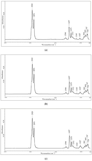 The oxygen-containing compounds are alcohols and phenols, ethers, aliphatic and aromatic ketones, esters and carboxylic acids and anhydrides [30]. Carbonyl stretching is one of the popular known bands used to evaluate the ageing of bitumen [6,31,32]. It is well known that development and increase in the carbonyl groups indicates an increase in the number of large molecules in the bituminous binder, resulting in higher stiffness and more solid-like behavior as a result of ageing [6]. It is usually the most intense band in the spectrum, and depending on the type of C=O bond, it occurs in the 1830–1650 cm−1 region. It may be absorbed above 2000 cm−1, under consideration at 2923 cm−1 and 2856 cm−1 [33,34]. Aliphatic and aromatic ketones show carbonyl bands at 1730–1700 and 1700–1680 cm−1, respectively, while aromatic aldehydes produce carbonyl bands in the range of 1720–1680 cm−1 [30].