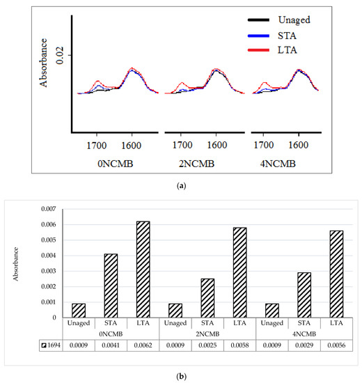The absorbance peak at the wave number of 1694 cm−1 represents the carbonyl acid absorbance value for the modified binders before and after ageing and is presented in Figure 4, where Figure 4a,b show the FTIR spectrum results of the band and its absorbance values, respectively. It is notable that an ageing effect was observed for all the modified binders, where the band of carboxylic acid was formed. However, the formation of this band varied between STA and LTA for the binders, showing that the most sensitive binder was 0 NCMB, where the value of the absorbance peak was higher than 2 NCMB and 4 NCMB after STA, by 39.02% and 29.27%, respectively. This means that an improvement against ageing occurred after adding NC particles. In addition, after LTA, the absorbance peak for 0 NCMB was higher than for the rest of the modified binders, but not as much as after STA, where the increase of absorbance for 0 NCMB was higher than 2 NCMB and 4 NCMB by 6.45% and 9.68%, respectively. The formation of carboxylic acid at a wave number of 1694 cm−1 was varied due to the addition of NC particles and ageing. The improvement in oxidation ageing resistance for 2 NCMB and 4 NCMB might be related to a unique property of NC, namely heat absorption. NC particles absorb heat and therefore reduce the effect of temperature on the bitumen structure during ageing and protect it from oxidation. This fact has been observed in previous studies where NC has been investigated [28,29,36].