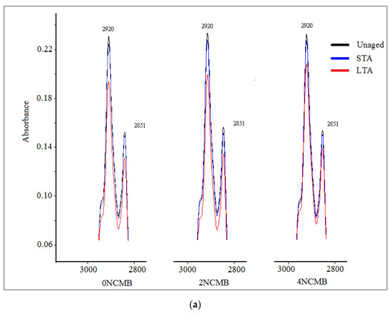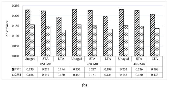 After STA, the absorbance at 2920 cm−1 for 0 NCMB, 2 NCMB and 4 NCMB was 0.225, 0.227 and 0.226, respectively, as presented in Figure 5b. The absorbance at 2851 cm−1 for 0 NCMB, 2 NCMB and 4 NCMB was 0.149, 0.156 and 0.153, respectively. It is clear that the STA procedure has little effect on these bands. After LTA, the reduction in absorbance peak value for both wave numbers continued, and variation in their absorbance was detected clearly between the modified binders. The 0 NCMB was more sensitive, where the highest reduction was recorded compared to 2 NCMB and 4 NCMB. The absorbance at 2920 cm−1 for 0 NCMB, 2 NCMB and 4 NCMB was 0.194, 0.199 and 0.208, respectively, and the absorbance at 2851 cm−1 for 0 NCMB, 2 NCMB and 4 NCMB was 0.130, 0.134 and 0.138, respectively.