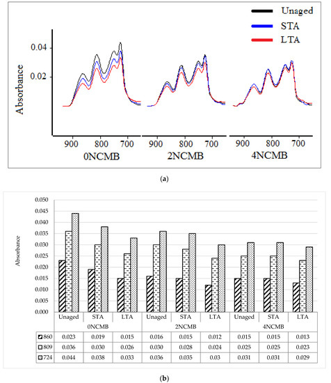 Aromatic compounds can be observed in five regions: 3100–3000 cm−1, 2000–1700 cm−1, 1650–1430 cm−1, 1275–1000 cm−1 and 900–690 cm−1 [30]. However, the last region is under evaluation; FTIR spectrum results of bands are presented in Figure 6a. Many vibrations may vary by hundreds of wave numbers, as per the bands in the region 900–700 cm−1; the variation in these bands showed differences in the absorbance for all modified bitumen after ageing, as can be seen in Figure 6b. These bands are called out-of-plane bending. The bands of the out-of-plane bending vibrations for compounds responsible for aromatics were strong and could be observed easily. For 0 NCMB, the variation in the bands before and after STA and LTA was very clear. Reduction in the absorbance value for the bands after ageing was observed. The absorbance of C-H out-of-plane stretching was reduced due to the effect of ageing, and the reduction was increased when ageing was more severe (LTA compared to unaged). The variations in the bands for 2 NCMB before and after ageing were different compared to 0 NCMB. The bands were more closed, and the effect of ageing was less as compared to 0 NCMB. In addition, the variations in the bands for 4 NCMB before and after ageing were more closed and similar. The results for unaged and STA were almost same. The results for LTA showed a slightly smaller reduction in the absorbance.
