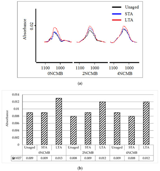 Based on the results presented in Figure 7a, sulfoxides are originally found in all modified bitumen. The S=O stretching shows stretching bands at 1060–1015 cm−1, but its absorbance peak may differ from the modified bitumen due to the addition of NC particles and ageing.