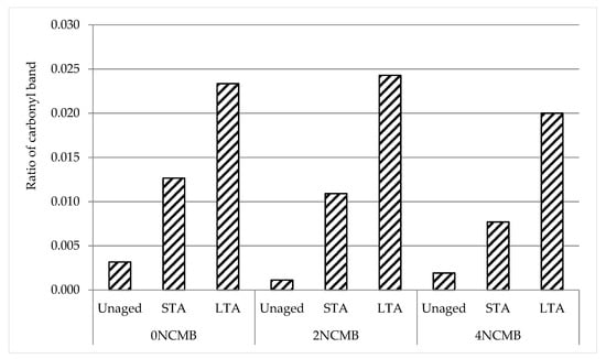 Based on previous studies [4,8,9,31,32,41,42], the formation and increase in the carbonyl index is observed after both STA and LTA for all binders. Formation of the carbonyl band centered around 1694 cm −1 is calculated, and as can be seen in Figure 8, the oxidation due to STA and LTA leads to an increase in the functional carbonyl group. As stated previously, carboxylic acids and ketones are the main oxidation products for the carbonyl group, and they are responsible for the increase of asphaltenes that leads to bitumen hardness [4]. However, the values of the ratio of the carbonyl band showed that the formation of this band for the unaged binders was higher for 0 NCMB compared to 2 NCMB and 4 NCMB, while after STA, the ratio decreased after the addition of the NC particles. An unexpected result was noted after LTA, where the ratio of the carbonyl band showed a slight increase for 2 NCMB compared to 0 NCMB (4%), while 4 NCMB revealed the best result. Generally, it can be concluded that NC particles enhance resistance to ageing; this result is consistent with previous studies [18,19,20,28,40].