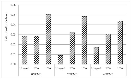 The ratio of the sulfoxide band was also calculated before and after ageing. Variation in the values of the ratio for unaged and STA did not give any clear information about whether NC particles improved resistance to ageing. The values showed that, when unaged, reduction in the ratio was noted for 2 NCMB and 4 NCMB compared with 0 NCMB, while after STA, the values were almost the same for all binders. The improvement in ageing resistance was only clear at the last stage of ageing, as can be seen in Figure 9, where 4 NCMB showed the least sensitivity to ageing, followed by 2 NC. Regarding the variation of the results for the ratio of the sulfoxide band for unaged and STA, the sulfoxide is thermally unstable [6], which is why the sulfoxide index was not considered as an ageing index in a previous study [43]. After LTA, a steady-state level may be attained, and at this level of ageing, the ratio of the sulfoxide band may be used to rank the sensitivity of the binders to ageing, where 4 NCMB shows less ageing sensitivity. Although the sulfoxide was thermally unstable, it showed an improvement in ageing resistance after LTA. This finding is in good agreement with a previous study done by Wang et al. [44].