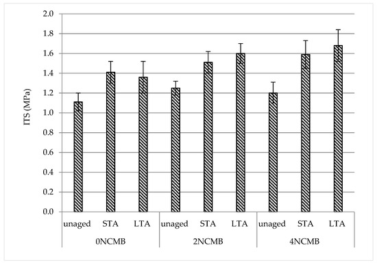 - The results of the ITS test were in line with previous results; STA and LTA resulted in increased ITS due to increased stiffness. The increase in the ITS of 2 NCMB and 4 NCMB indicates improved cohesion of the aged bitumen in the mixture, which could reflect improved resistance against cracking, leading to increased pavement durability.