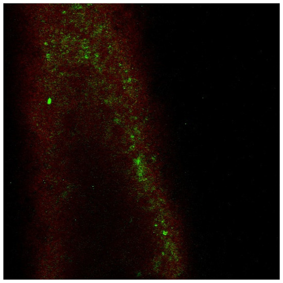 Confocal laser scanning microscopy image of bacteria and biofilm generated over a gutta-percha segment.