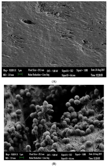 (A) Scanning electron microscope image of biofilm on infected GP. (B) Scanning electron microscope image of sterilized GP.