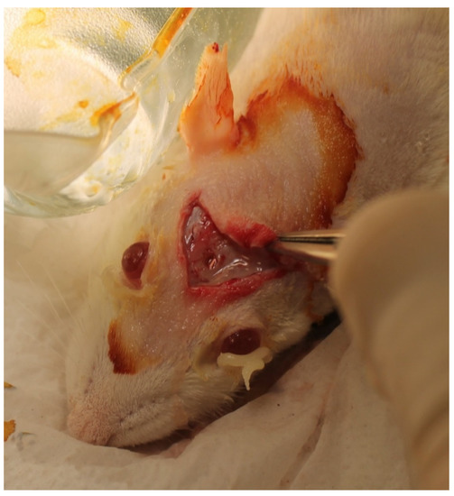 A modification of Turnbull and Freeman’s (1974) original surgical approach was used [18]. A U-shaped incision was made in the scalp between the eyebrows that caudally connected two sagittal incisions extending posteriorly over the parietal bone to enable the elevation of a full-thickness flap and expose the soft tissues covering the calvarium. The fascia overlying the bone was dissected to expose the periosteum (Figure 3). A high-speed, water-cooled, diamond wheel-shaped bur was used under 2.5× magnification (Orascoptic, Middleton, WI, USA) to create a bony defect measuring 3 mm in diameter and 1 mm in depth while avoiding damage to the dura mater or puncturing the sagittal sinus.