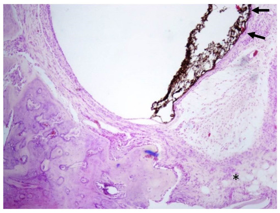Histologic micrograph showing foreign material surrounded by a thin fibrous connective tissue capsule (arrows) and mild chronic inflammatory cell infiltrate composed primarily of lymphocytes (asterisk).
