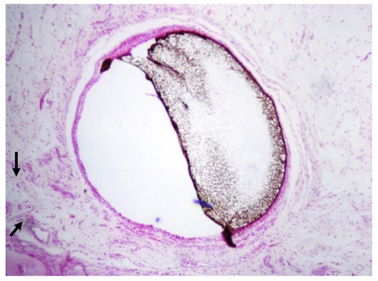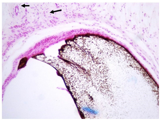 Histologic micrograph of foreign material surrounded by a thin fibrous connective tissue capsule. The matrix contained mild inflammatory cell infiltrate composed primarily of lymphocytes and few scattered small blood vessels (arrows). H&E: hematoxylin & eosin stain, ×200.