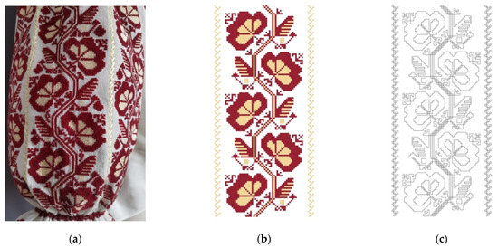 Traditional motif from Ţara Bârsei subjected to the present research: (a) the picture of the textile object, (b) the digital vector format drawing, and (c) the contour of the ornament used by the CNC router for milling the maple wood surface.