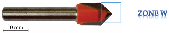 It is found that the wear of the tool used for engraving is 37.5% for the cutting area (see Figure 5) and 26.7% for the tip area (Figure 6). For the tool used for V-Carve milling, the wear is 41.2% for the cutting area (Figure 7), while for the tip, it was 42.8% (Figure 8). These data show that, in the case of milling with the Engrave method, the wear of the tool was less pronounced than that in the case of V-Carve milling. The explanation is related to the length of the tool path for the two applied methods (approx. 19.2 m when the Engrave method was applied and 49.7 m when the V-Carve method was applied).