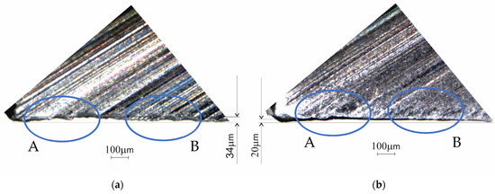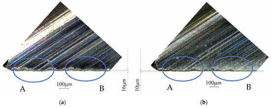 Zone W rotated by 90° of the V-Carve tool (120× magnification) on a stereo-microscope: (a) initial; (b) after twenty uses. A and B circled areas are the more affected one because of the wear process.