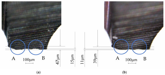 Zone W of the V-Carve tool (120× magnification) on a stereo microscope: (a) initial; (b) after twenty uses. A and B circled areas are the more affected one because of the wear process.