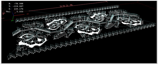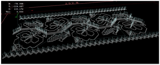 In Figure 9 and Figure 10, the tool path simulated by Linux CNC version 2.7.0. software is represented. The dashed line represents the trajectory traveled when idling, and a continuous line represents the path traveled during processing. With an interrupted red line, the shape and dimensions of the wooden piece are presented.