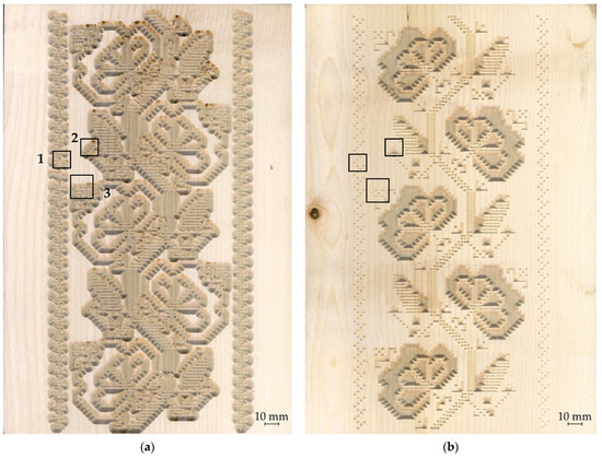 The CNC routed ornaments: (a) using the Engrave method; (b) using the V-Carve method. Areas marked with 1, 2 and 3 were identified to be characterized by pronounced wood fuzziness.