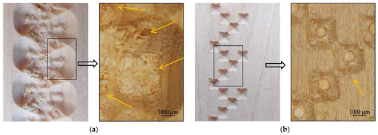Detail 3 from Figure 8 subjected to stereo-microscopy analysis with 22.5× magnification: (a) ornament obtained by the Engrave method: detail from the picture (left) and the image with 22.5× magnification (right); (b) ornament obtained by the V-Carve method: detail from the picture (left) and the image with 22.5× magnification (right).