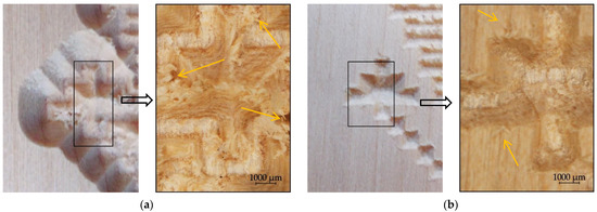 Studying the ornaments processed by the two methods, three zones where wood fuzziness occurred after processing the ornament by the Engrave method on the wood surface were highlighted. These zones are marked in Figure 11a, and they were assigned the numbers 1, 2, and 3. These zones were subjected to a stereo-microscopy analysis with 22.5× magnification and compared to similar zones of the V-Carved ornament. The images are presented in Figure 12, Figure 13 and Figure 14 for the Engrave method (a) and for the V-Carve method (b). The arrows indicate fuzzy grains on the wood surface, more numerous and larger in size than on the variant of the ornament for which the Engrave method was used.