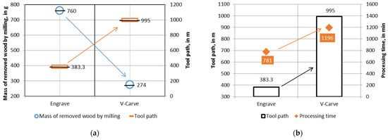 Comparison between the Engrave and V-Carve methods applied to CNC routing of an ornament on a maple wood surface: (a) correlation between the mass of removed wood and tool path length; (b) correlation between the tool path length and processing time.